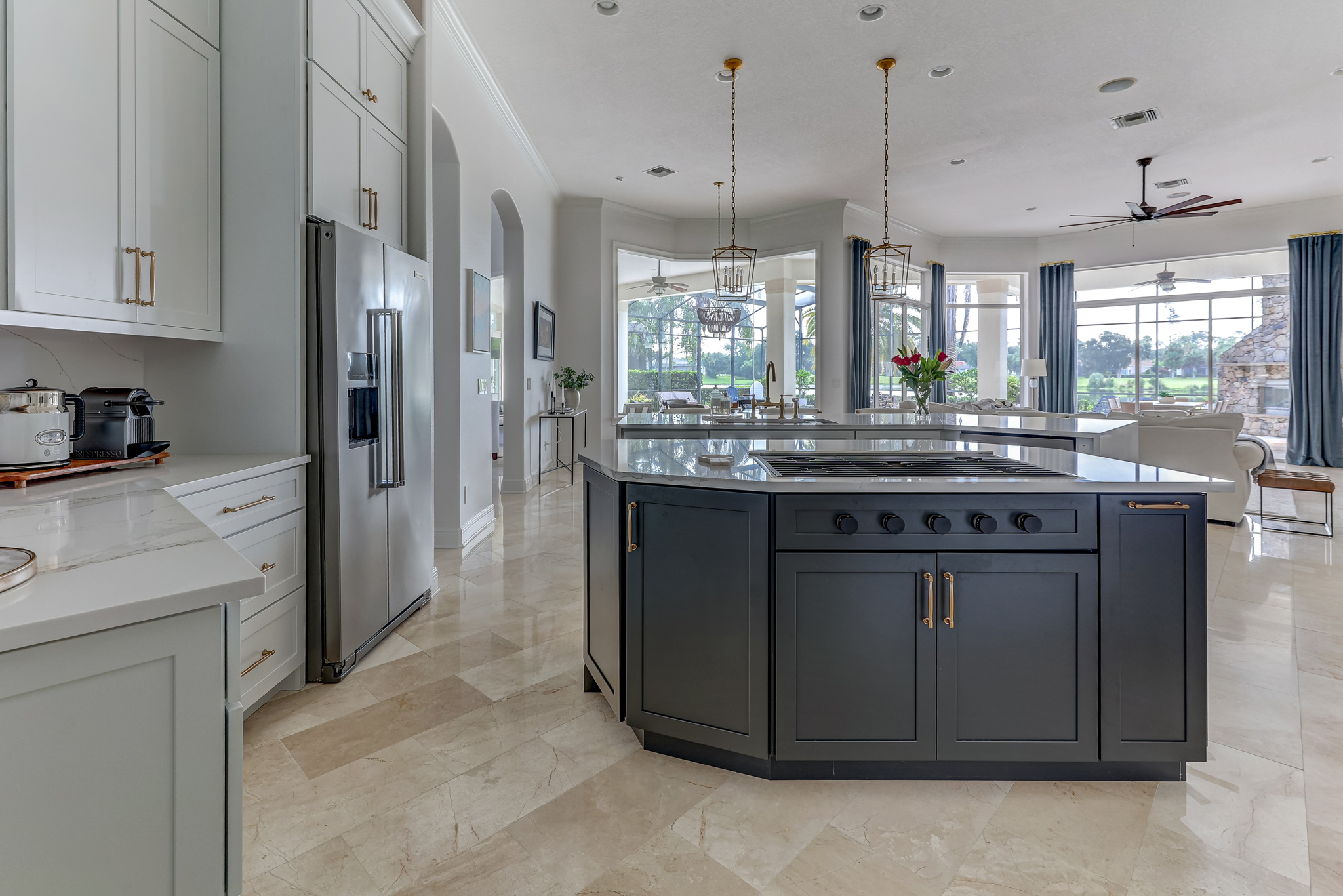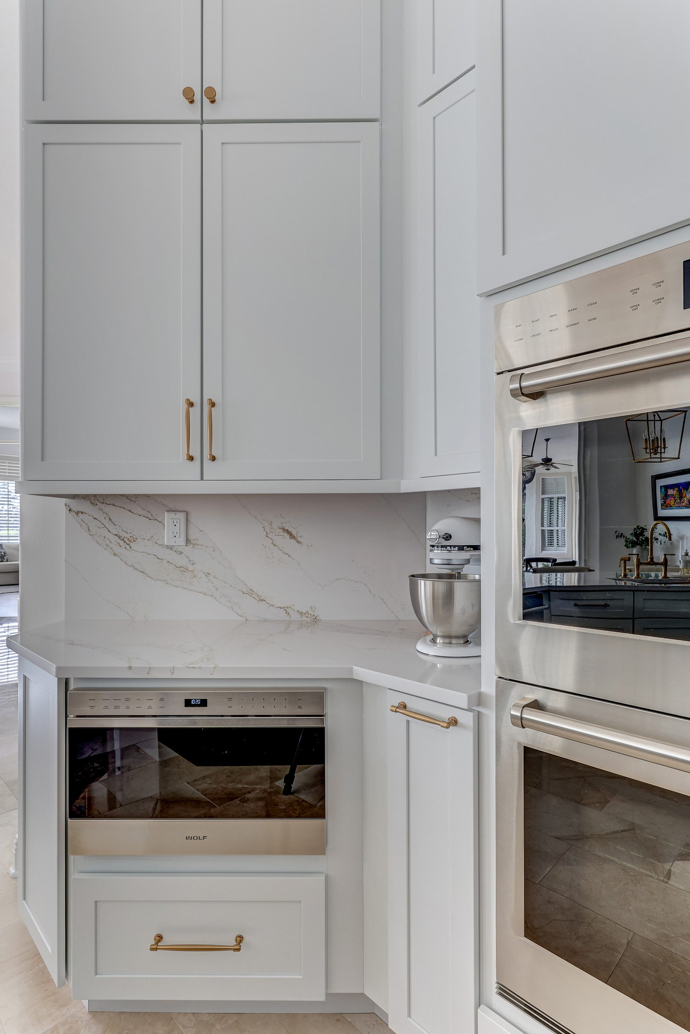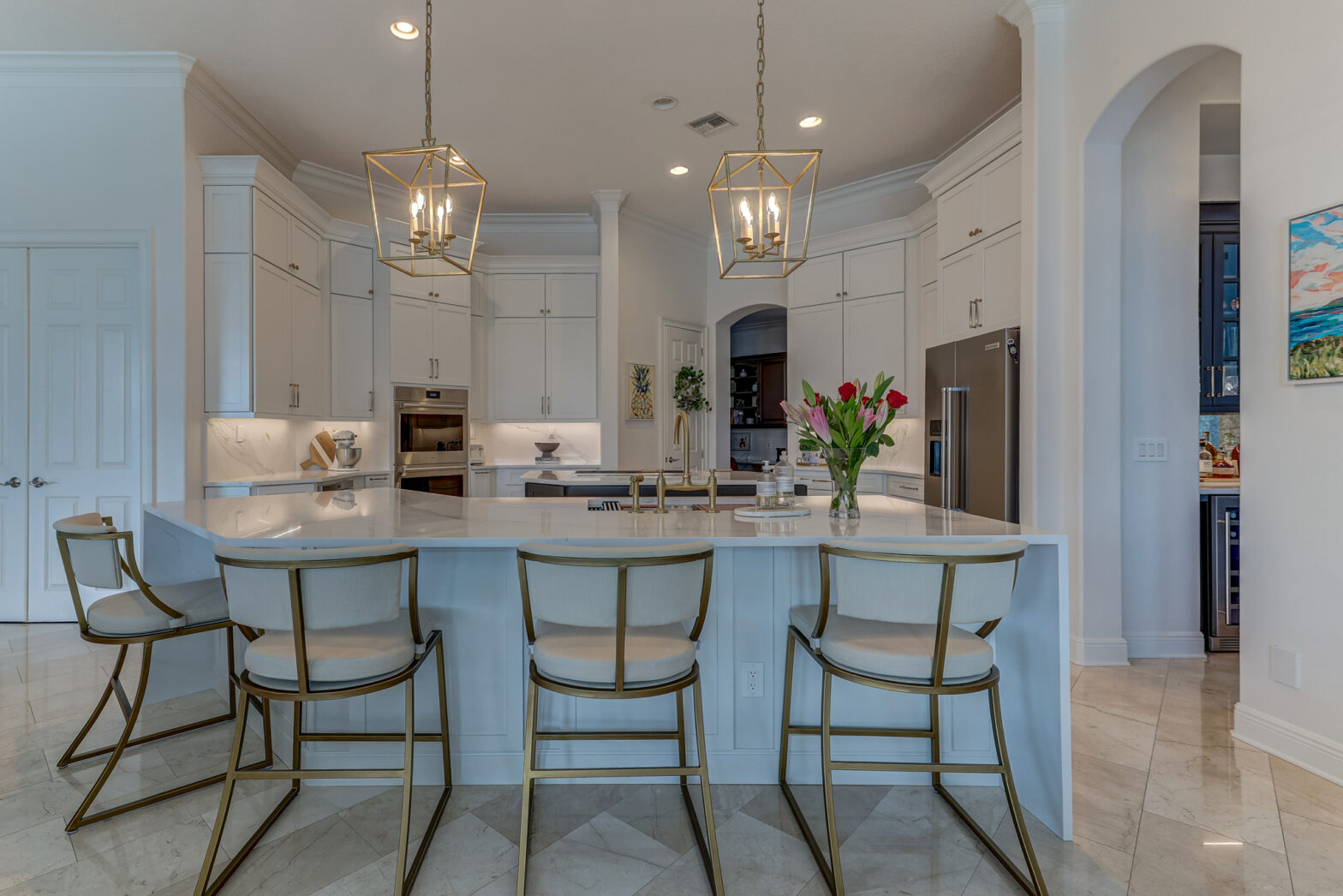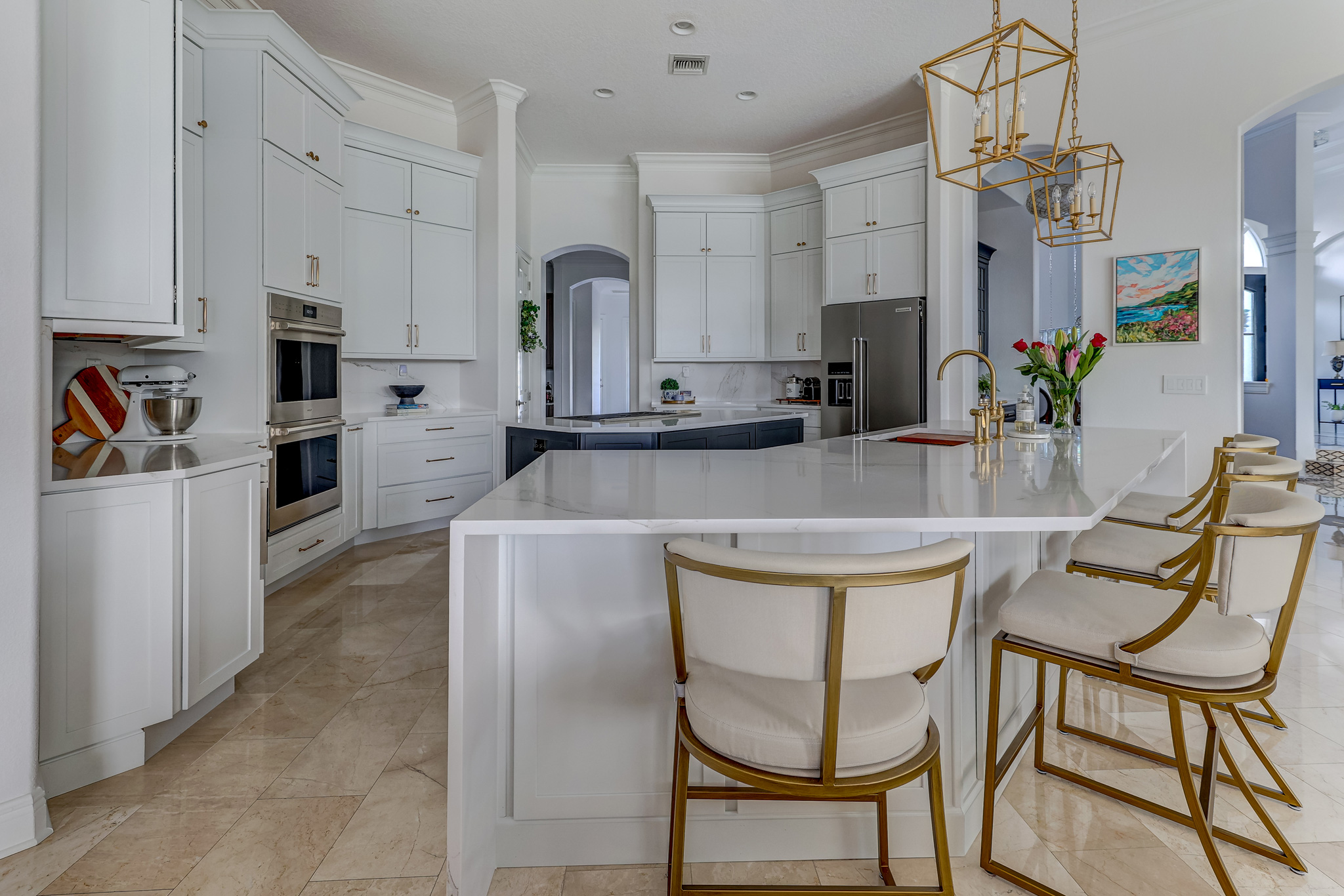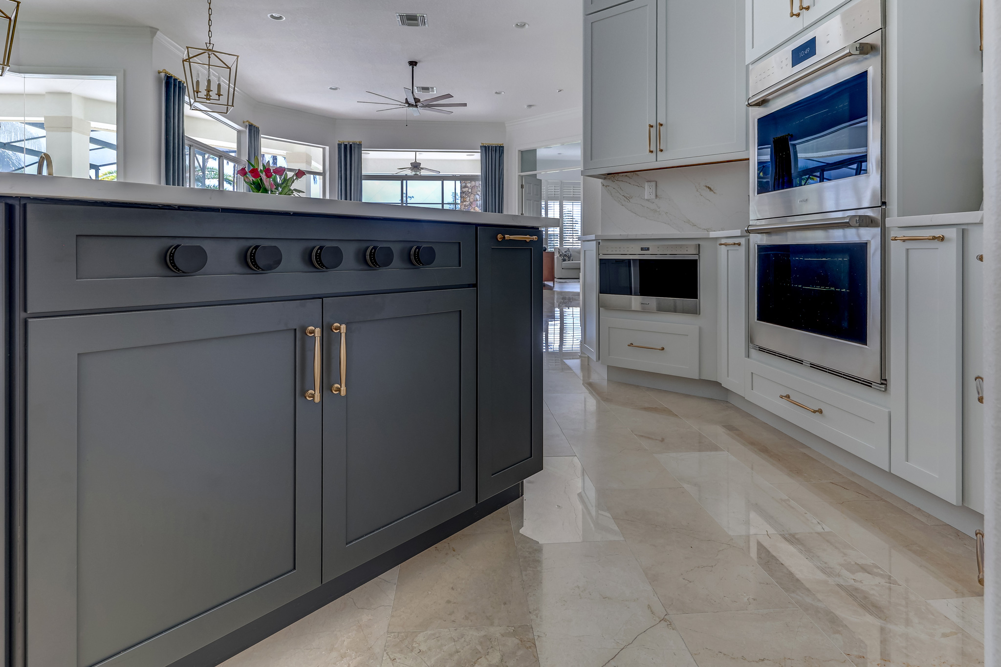 We recently completed a luxury kitchen renovation in Alaqua Lakes, transforming a dated traditional layout into a bright, elegant, and highly functional space. The new design features full-overlay white shaker cabinetry with a contrasting deep navy island, complemented by sleek gold hardware and accents for a timeless yet modern appeal.