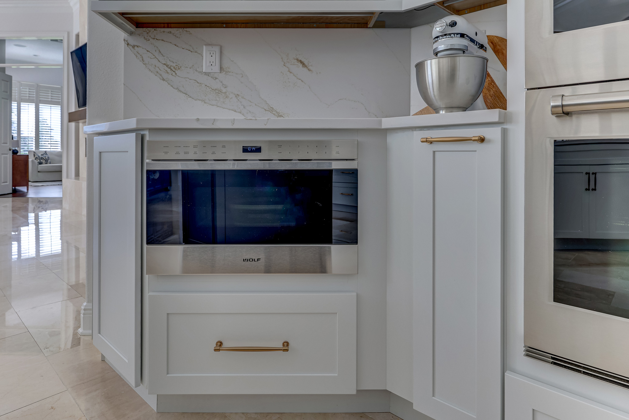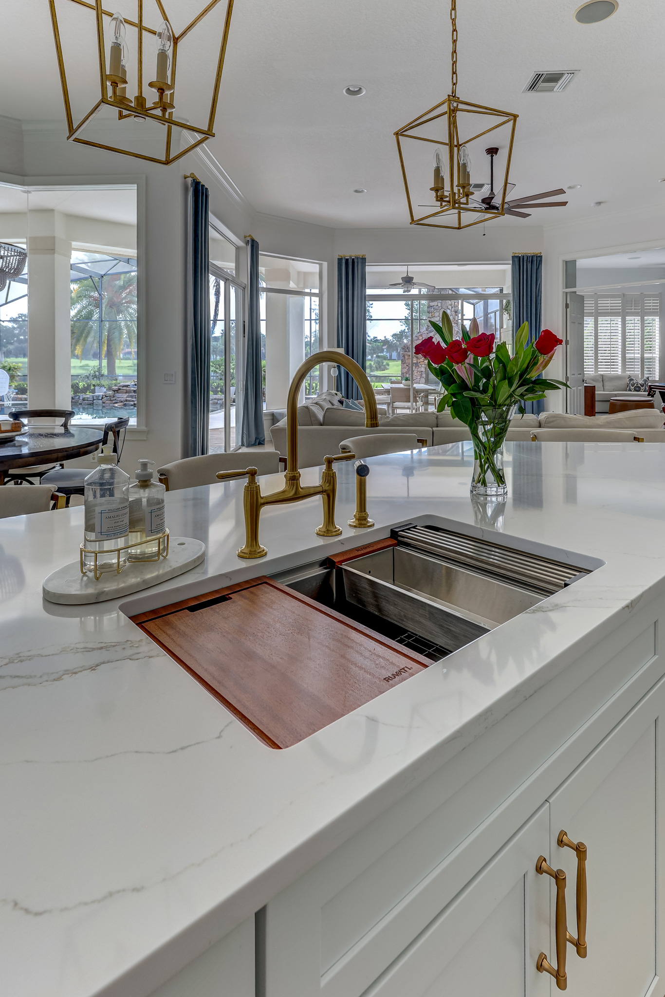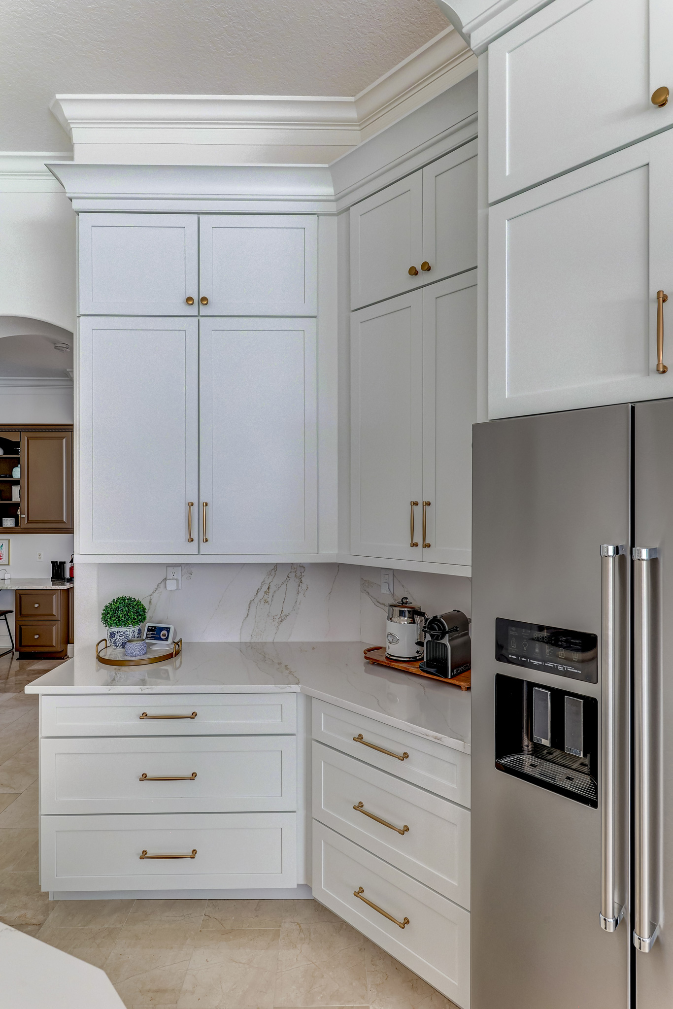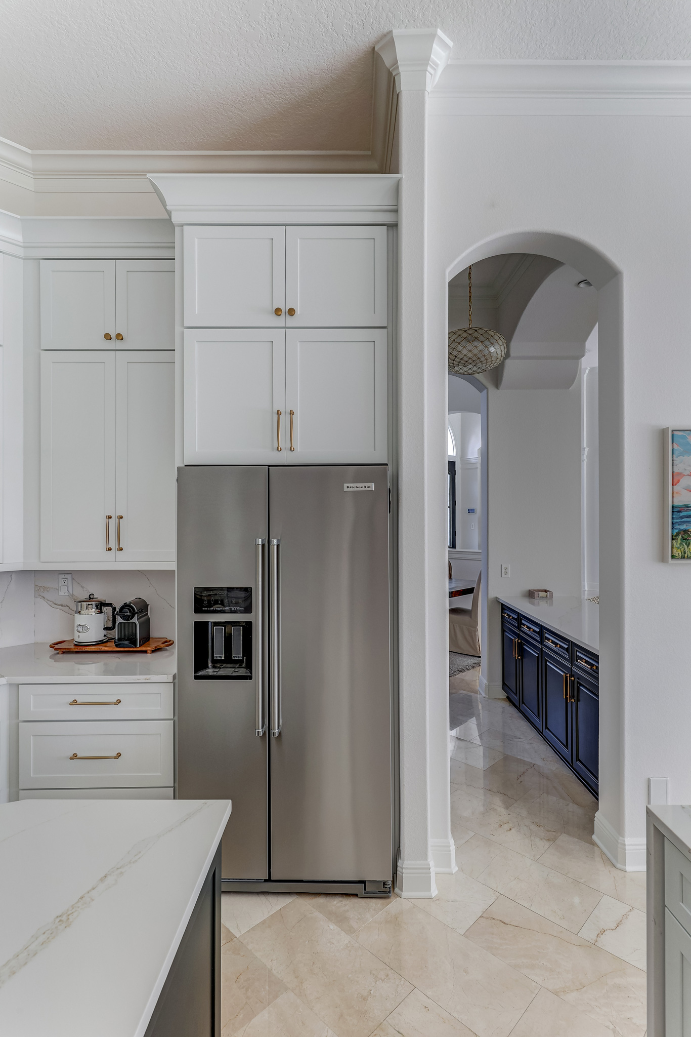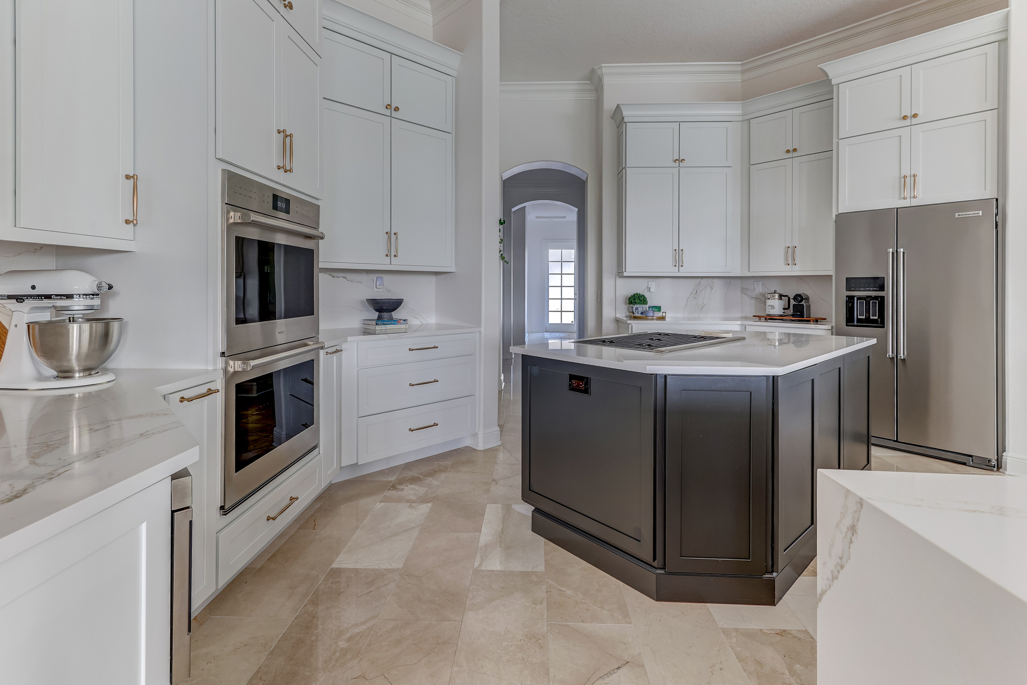 We recently completed a luxury kitchen renovation in Alaqua Lakes, transforming a dated traditional layout into a bright, elegant, and highly functional space. The new design features full-overlay white shaker cabinetry with a contrasting deep navy island, complemented by sleek gold hardware and accents for a timeless yet modern appeal.