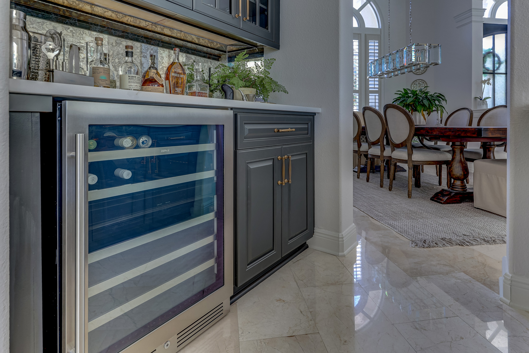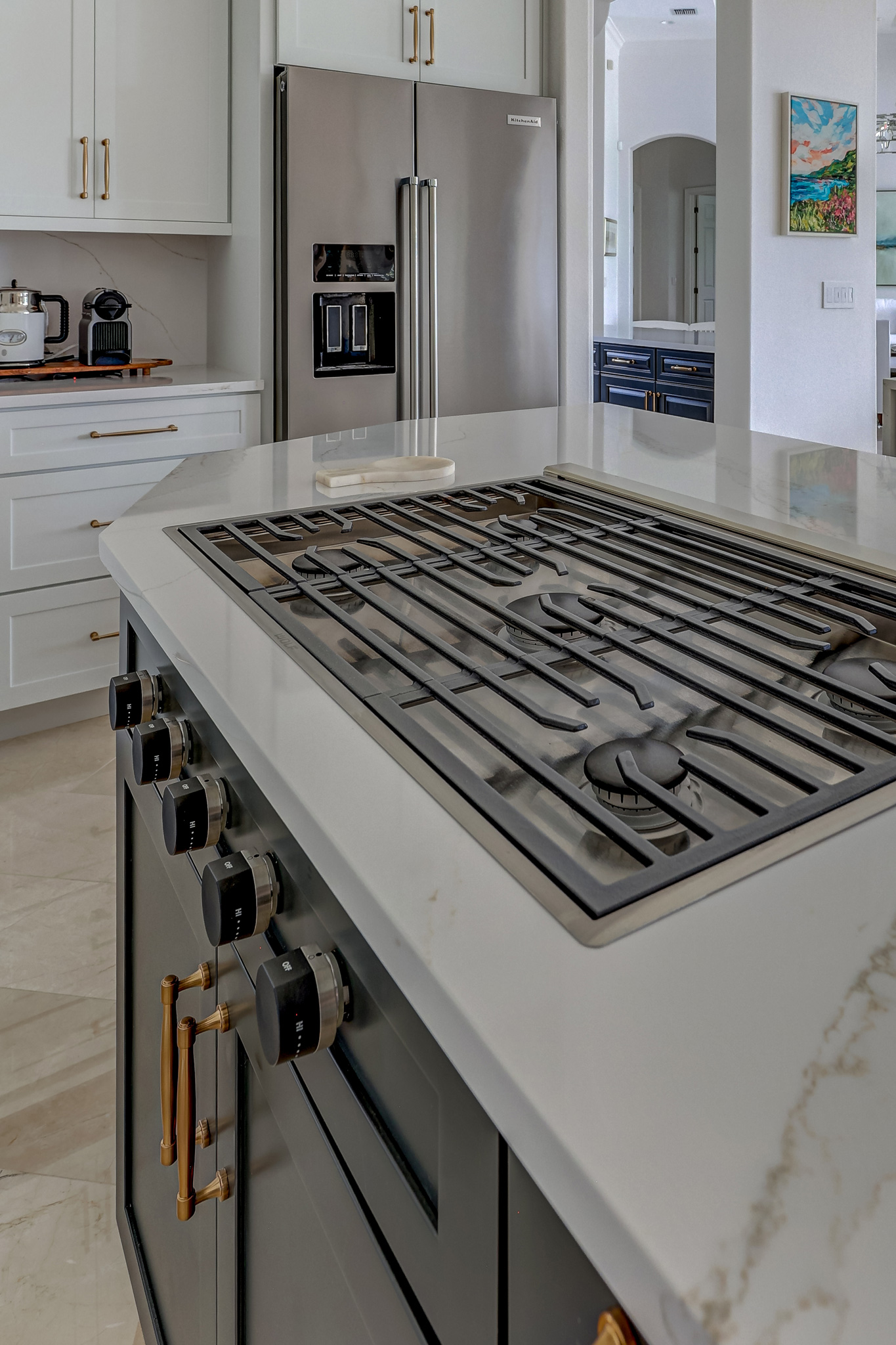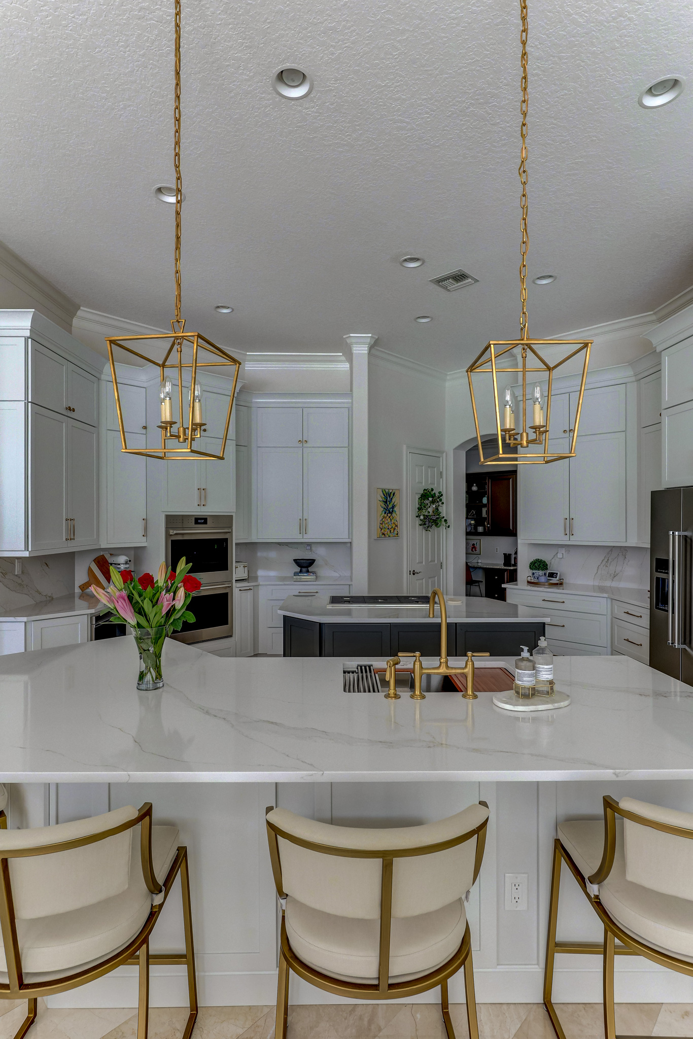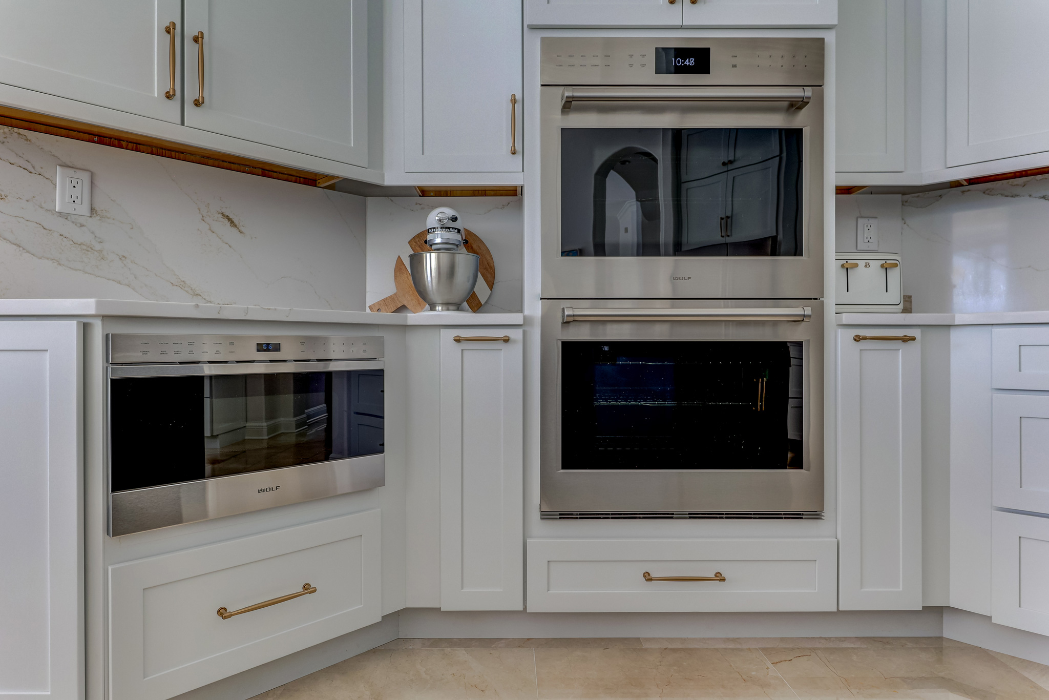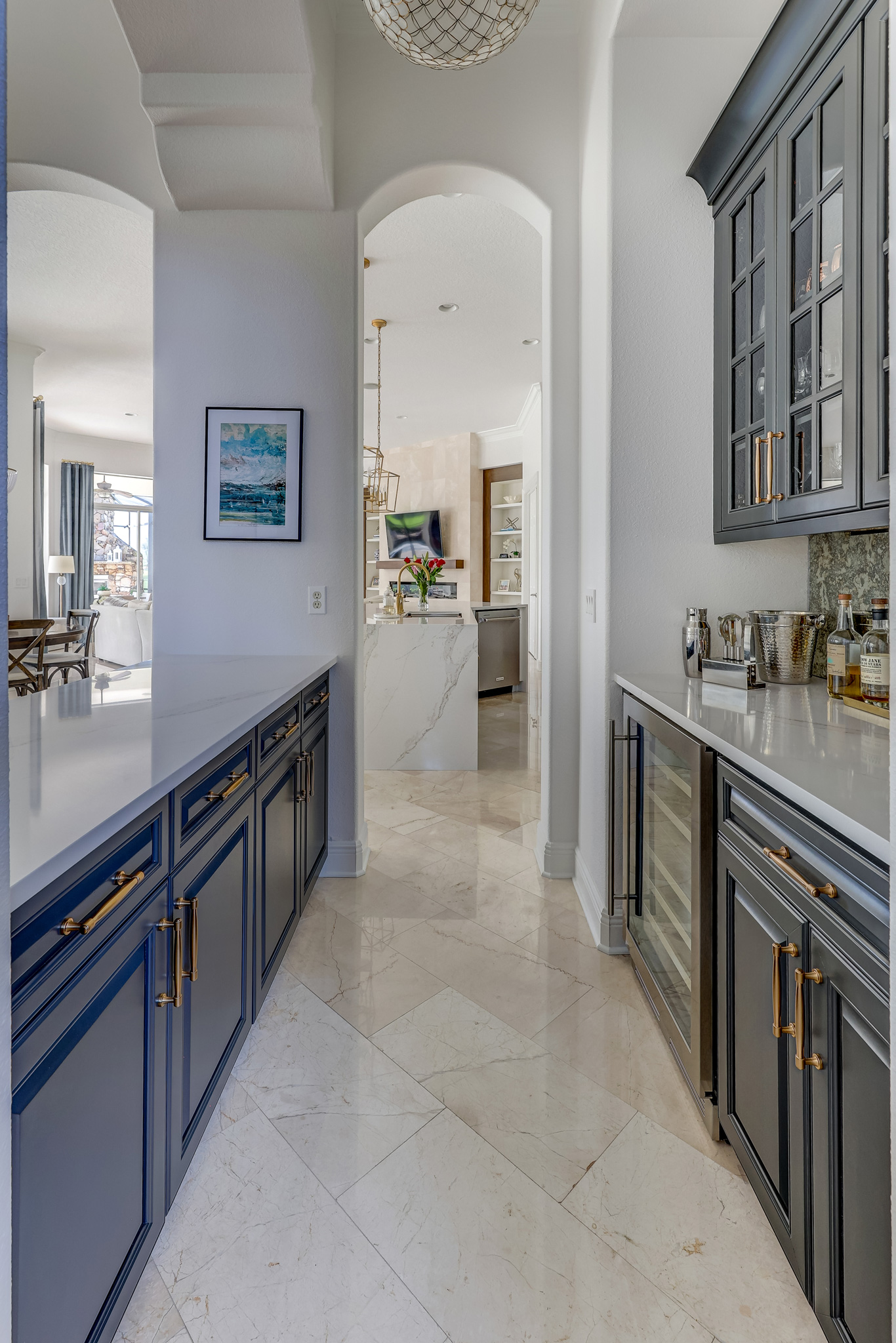 We recently completed a luxury kitchen renovation in Alaqua Lakes, transforming a dated traditional layout into a bright, elegant, and highly functional space. The new design features full-overlay white shaker cabinetry with a contrasting deep navy island, complemented by sleek gold hardware and accents for a timeless yet modern appeal.