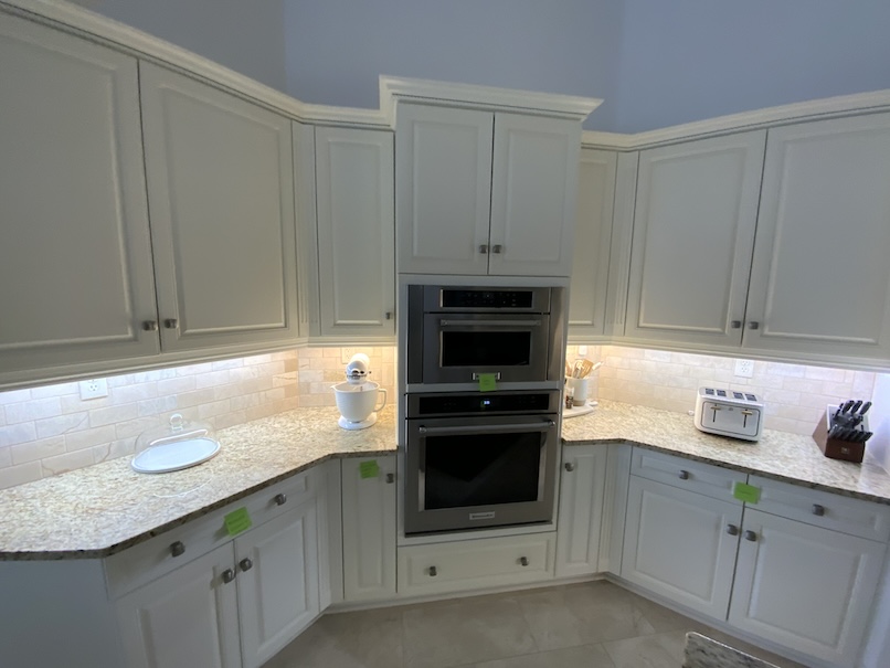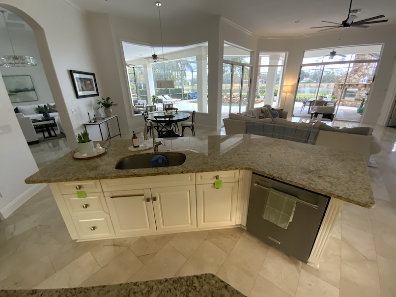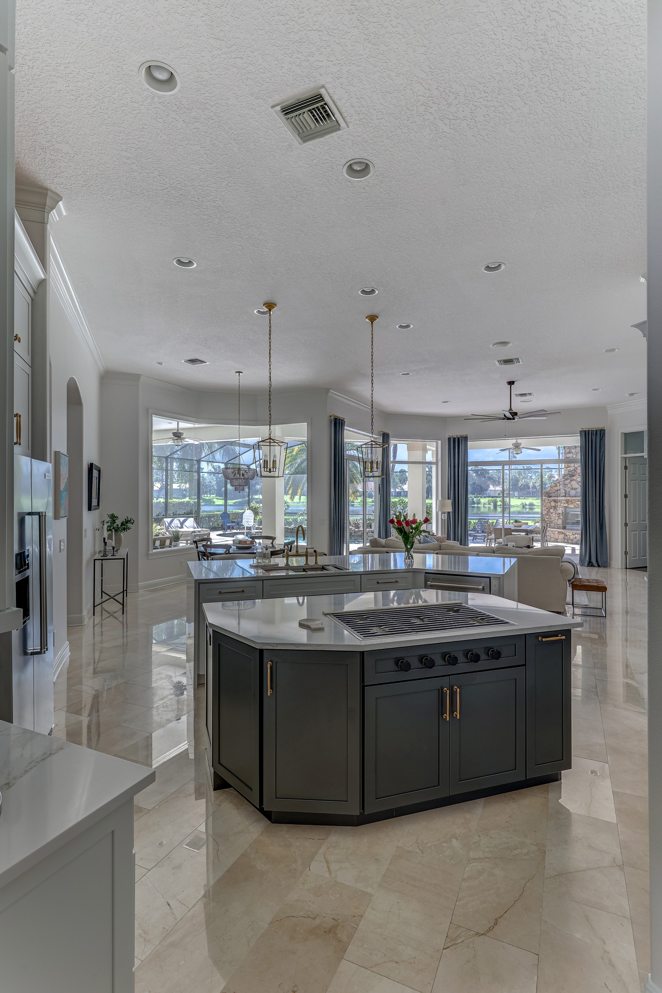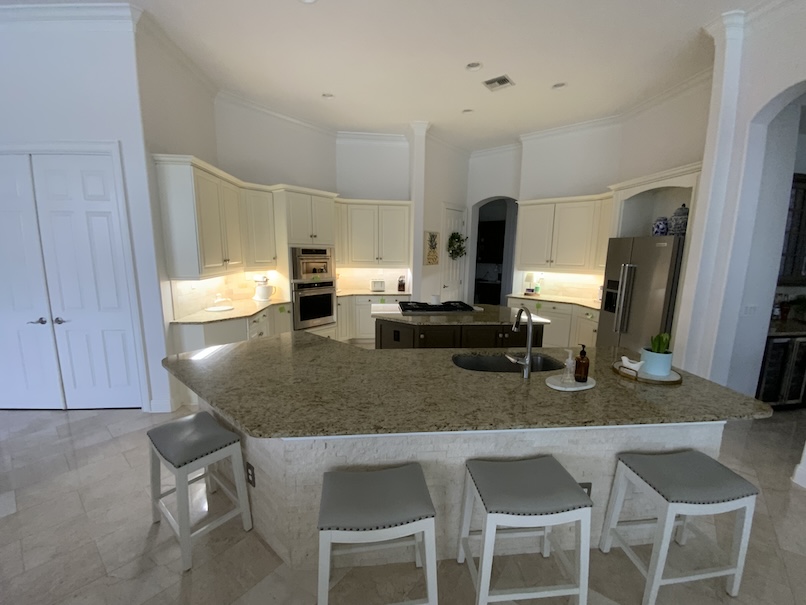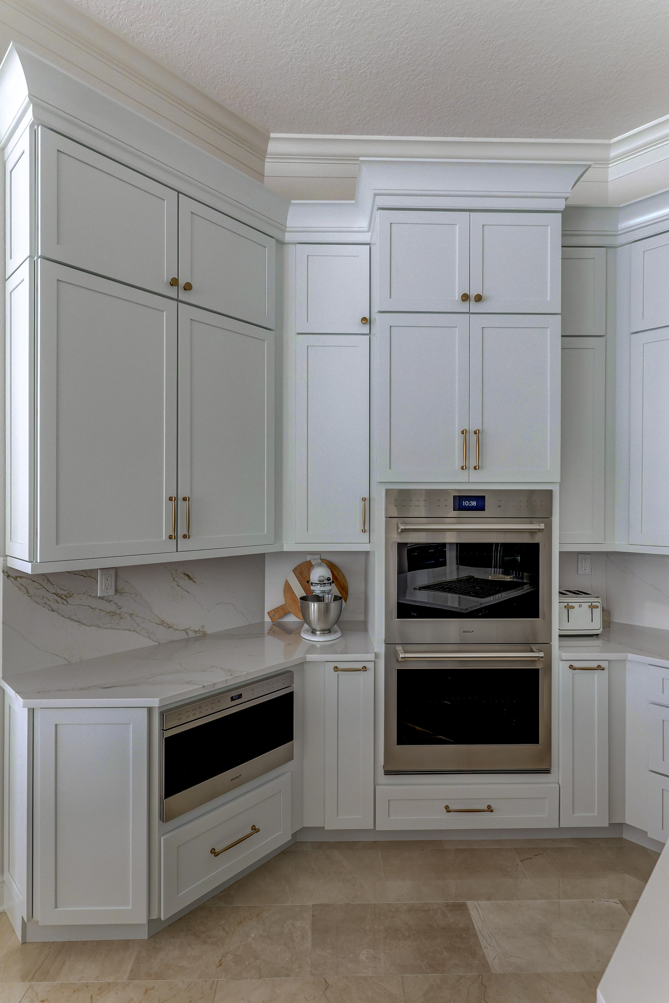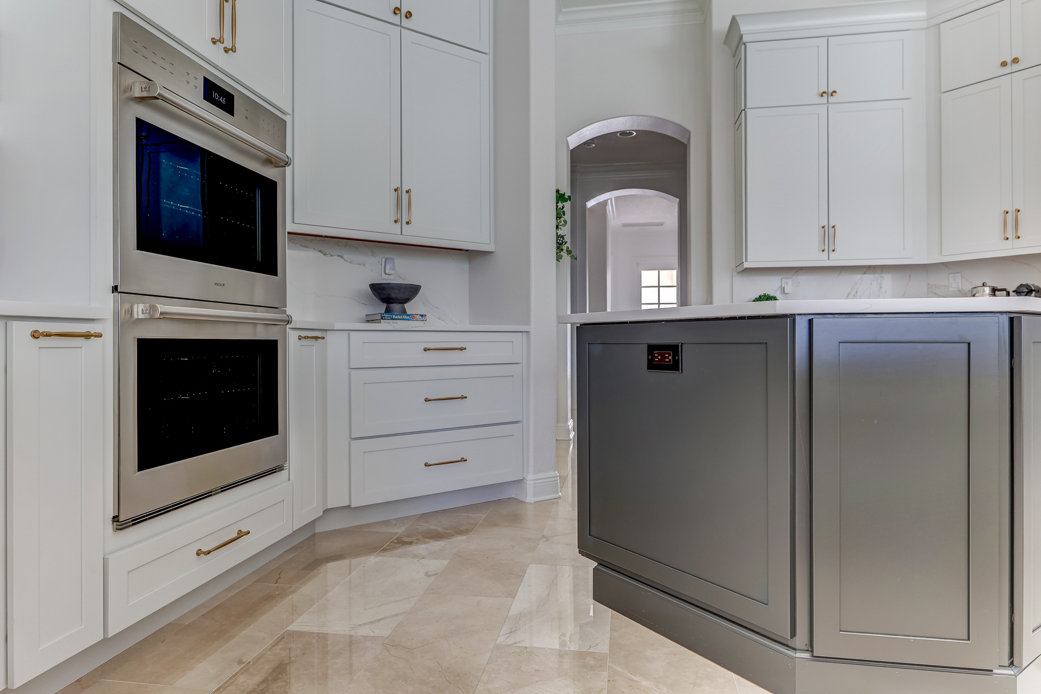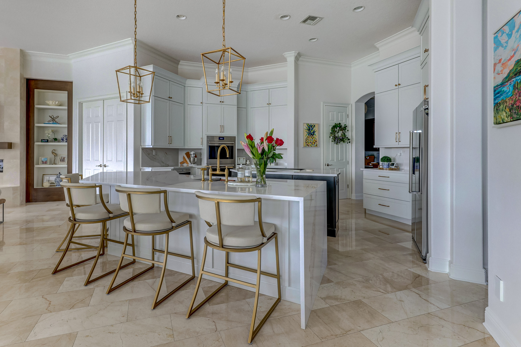 We recently completed a luxury kitchen renovation in Alaqua Lakes, transforming a dated traditional layout into a bright, elegant, and highly functional space. The new design features full-overlay white shaker cabinetry with a contrasting deep navy island, complemented by sleek gold hardware and accents for a timeless yet modern appeal.