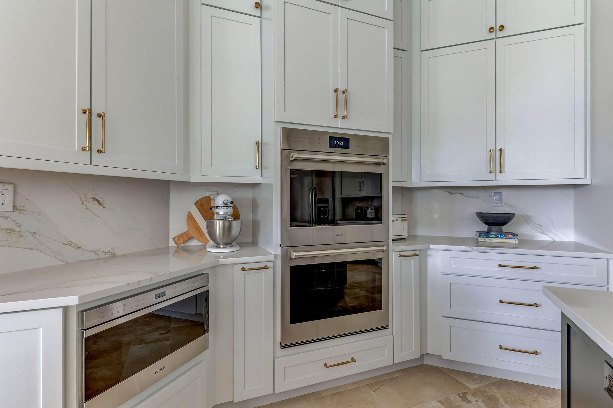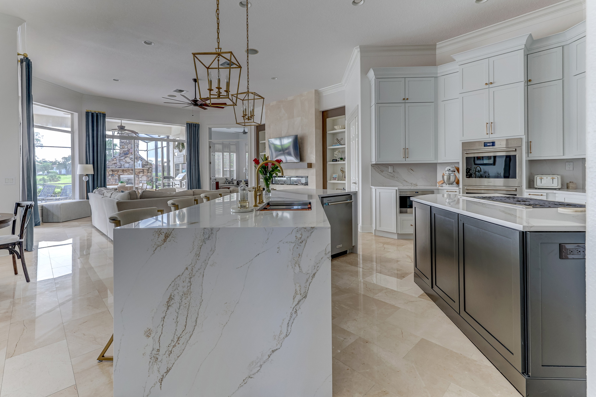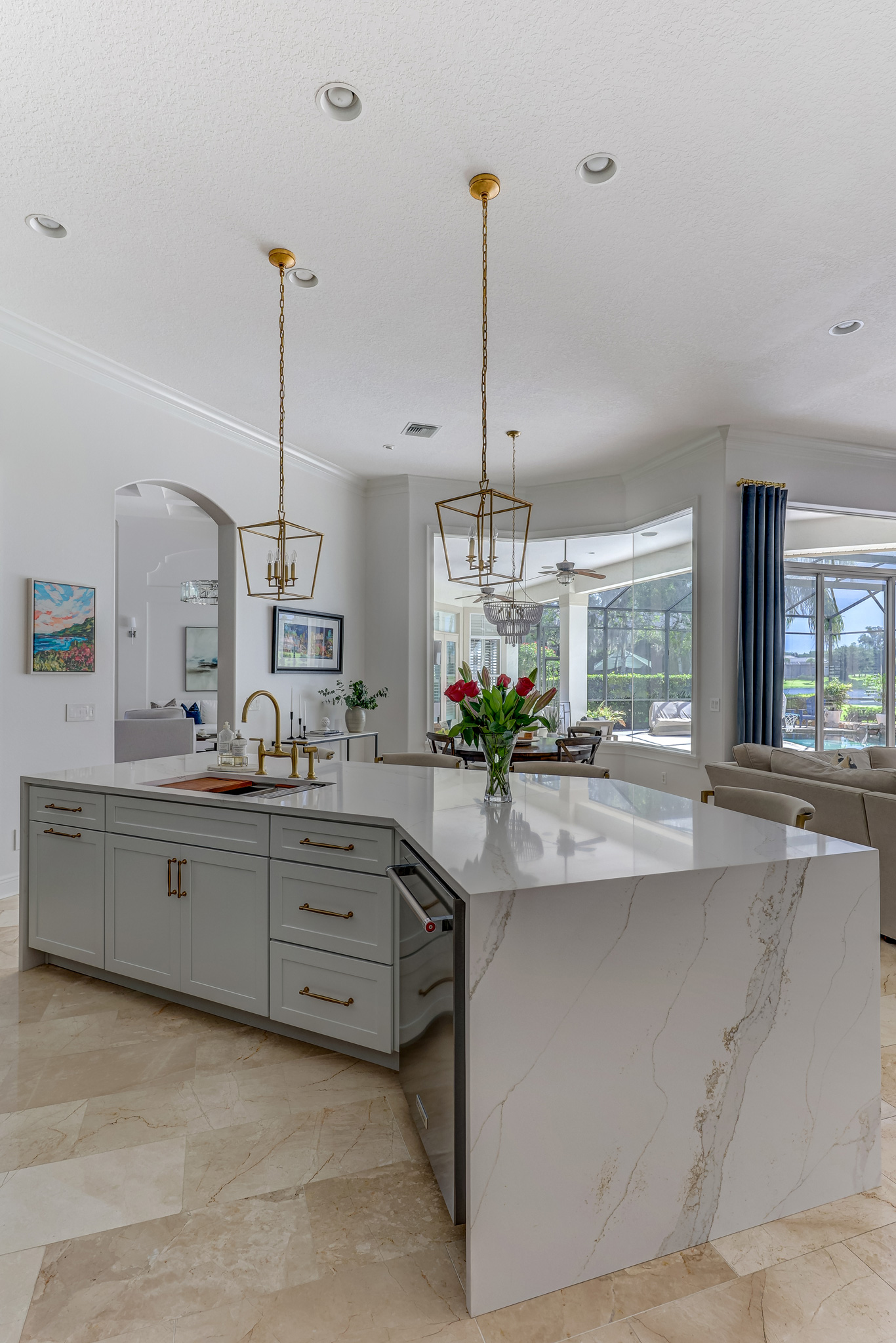 The countertops were upgraded to stunning quartz with a mitered waterfall edge, creating a seamless, sculpted look that anchors the room. Custom cabinetry maximizes storage and efficiency, while new pendant lighting adds warmth and sophistication. A workstation sink and integrated modern appliances further enhance usability and design flow, perfectly connecting the kitchen with the home’s open living space.